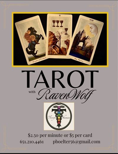 Send an email or call to get in touch for more information or to set up an appointment. Tarot and Reiki sessions are available in person in the Minneapolis , or remotely via Zoom or teams.